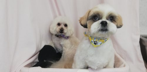 シーズーのこむぎちゃんとマルプーのシロちゃん 真っ白にしてもらいな(^^)とママさん もちろんフルフルセットの…
