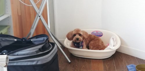 チワプーのティノちゃん 出かけようとしたら・・・ トリミングではなく違う所へ行くのかと思った??のか なかなか…