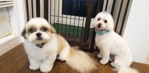 シーズーのこむぎちゃんとマルプーのシロちゃん 今日は揃ってお手入れDAY♪ こむぎちゃんは伸ばしてモコモコシー…