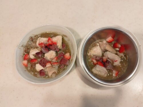 小分けストックしていた 野菜缶に甘酒を混ぜたものに 鶏肉と豚ヒレをON♪ イチゴちゃんもおすそ分け✧◝(…