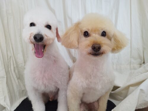 プードルちゃんず 少し間隔が空いてしまいだいぶ伸びてしまった毛 お手入れ前にブラッシングを頑張ってきてくださり…