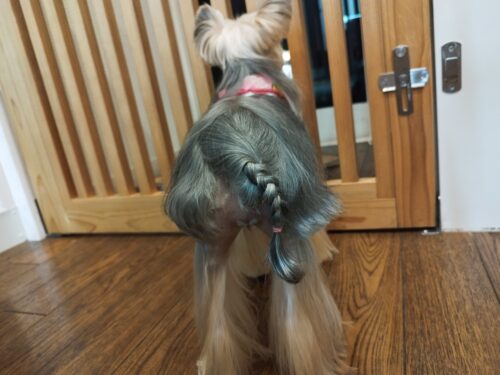ヨーキーのあいちゃん お散歩でハーネスを使うので もつれのお手入れが大変 でもまだ黒毛のサラサラヘアーを楽しみ…