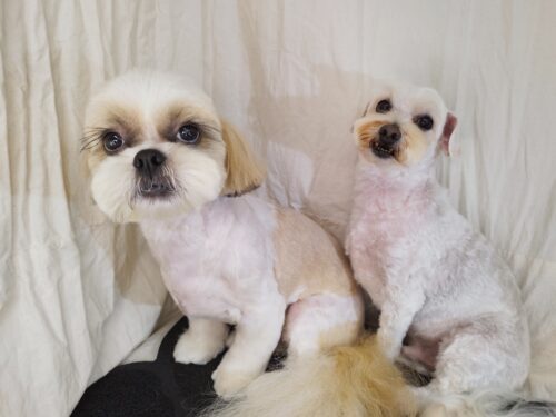シーズーのこむぎちゃんとマルプーのシロちゃん こむぎちゃんはまだ患部の家シャンを頑張っているので いつもならそ…