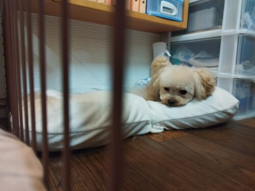 プードルのコムちゃん お手入れ後 今日はテーブルの下でお寛ぎモード そのクッション気に入った??  …