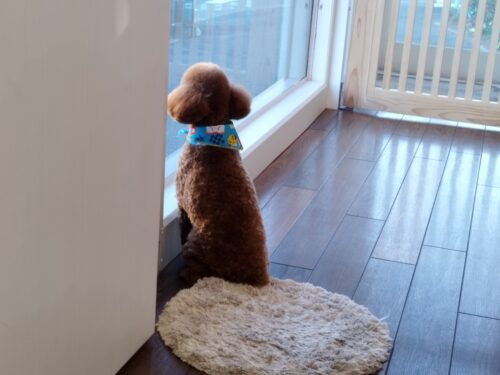 プードルのクッキーちゃん ちょこんとお座りして外を眺めお迎え待ち♪ 敷物に座れば良いのに 端っこにちょこん 遠…
