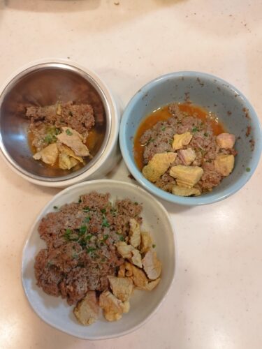 モコずのご飯です( ꈍᴗꈍ) メインフードはwoof トッピングは豚肉とブロッコリース…