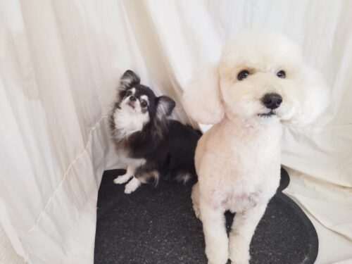 プードルのモカちゃんとロンチのニコちゃん 仲良くシャンプーDAY♪ 一緒に写真を撮ろうとすると ニコちゃん隅っ…