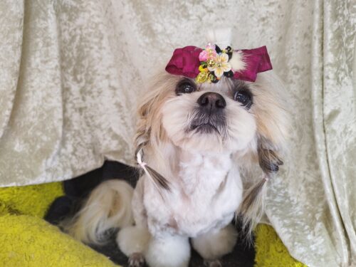 シーズーのみみこちゃん ずっと伸ばし続けているお耳 ママさんの目標はおさげスタイル 念願のおさげ できました(…