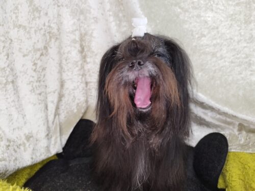 チワプーのたいちゃん 眼の上の毛がなかなかトップノットに届かず わさっと垂れてきてしまい お散歩しているとおめ…