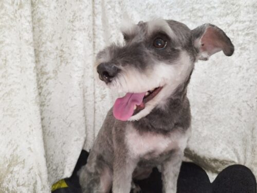 ミニシュナの福ちゃん お手入れ終盤のお顔カット中に雷ゴロゴロ その度にビクン!とする福ちゃん どうやら雷さん苦…