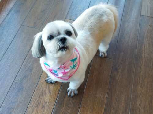 シーズーのみかんちゃん 下におろしたみかんちゃんを上から眺め 太ってます。。。とママさん(^^;) ダイエット…