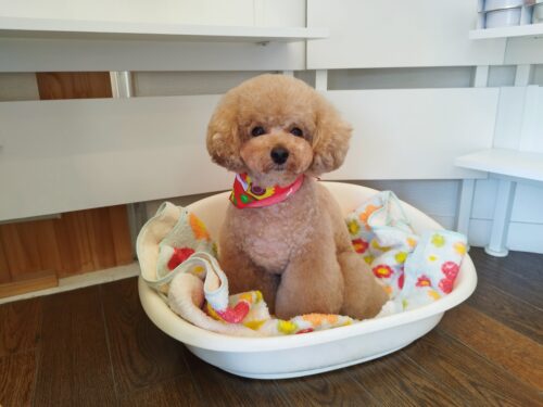 プードルの花ちゃん あ!お気に入りのベッド出すの忘れてた! 用意するとすぐにIN♪ これこれ!!!って思ったか…