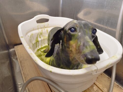 ダックスのロビンちゃん 今日はポイントサービスのハーブパック♪ できるかしら??と心配げなママさん ぜぇ~~ん…
