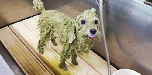 プードルの もも太郎ちゃん もちろんハーブパックと歯磨き付きのフルコース(^^) すっかり定着??の緑なもも太…