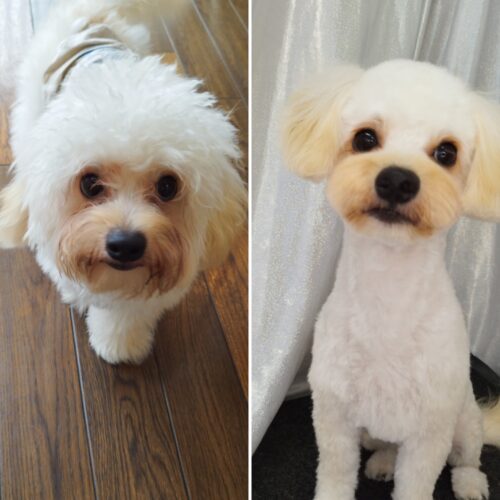 プードルのりりちゃん 1か月半開いてしまい 伸びてきた感じはかわイィのですが お洋服を着るので流石にもつれちゃ…