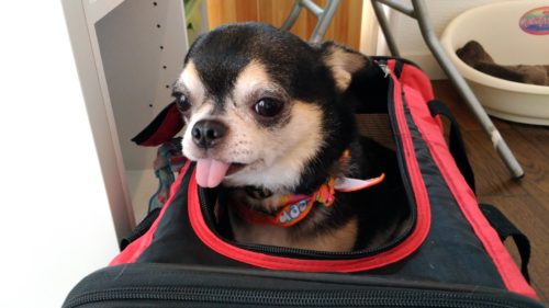 チワワのしじみちゃん お店に到着してマイバッグが開くと びっくり箱のおもちゃの様にピョン!と飛び出してきます …