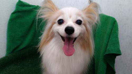 パピヨンのマロンちゃん 13歳のシニア犬ですがとても元気♪ しっかりアンダー抜いてさらっさら ママさんのお迎え…