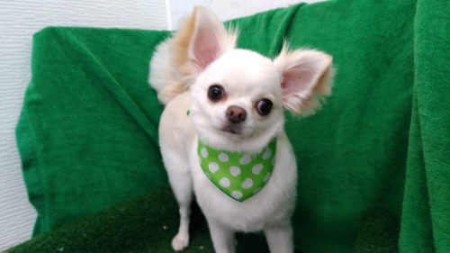 ロングコートチワワのむぎちゃん サロンでのトリミングは初めてという1歳♪ サッパリカットしたい派とそのままで良…