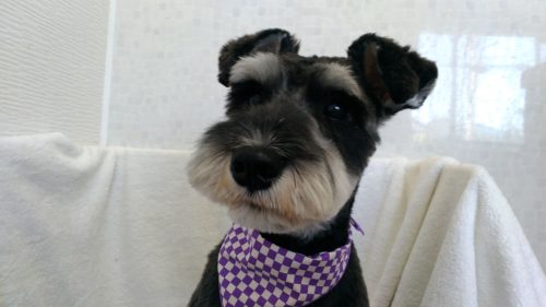ミニチュアシュナウザーの福ちゃん 柴犬位の長さに短くしたいとのご希望 あまりツルンツルンは嫌という事で前回より…